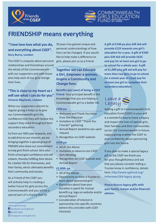 Imagine a world where inspired FRIENDS across the Commonwealth want to see inspired girls in the Commonwealth educated! A world where girls who are educated and empowered through secondary education become agents of change for others in their communities and countries through the friendship of Commonwealth citizens everywhere. We have launched Friends to bring you together with our other friends to help us to continue to educate girls.